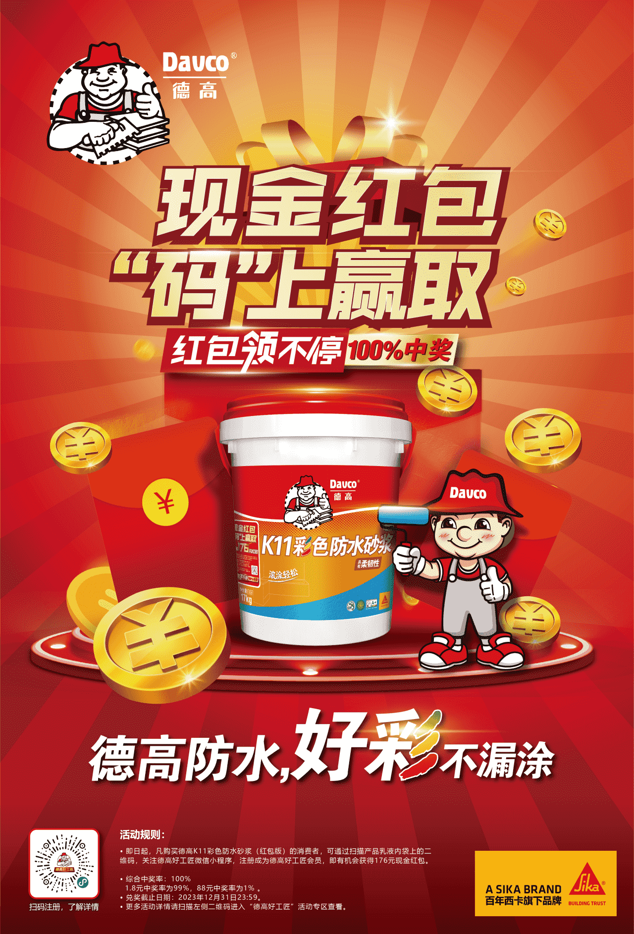 另外,購(gòu)買(mǎi)德高K11彩色防水砂漿(紅包版)的消費(fèi)者可留意其紅包掃碼活動(dòng),有機(jī)會(huì)獲得176元現(xiàn)金紅包!