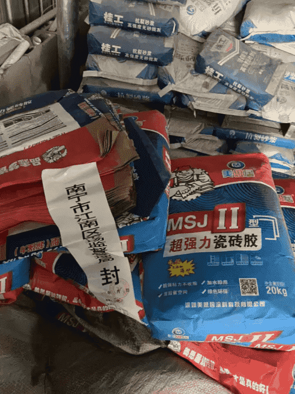 廣西南寧行政查處一生產(chǎn)窩點(diǎn)查扣美思居Ⅱ型瓷磚膠成品18包及包裝袋3000個(gè)。