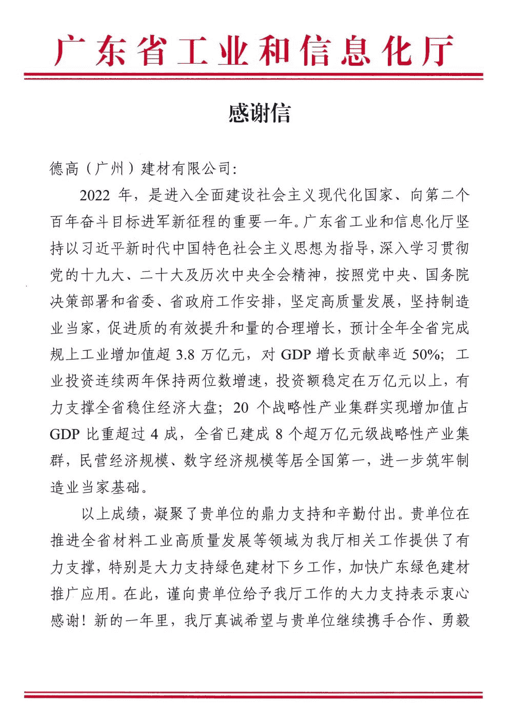 近日,西卡德高收到來自廣東省工業(yè)和信息化廳的感謝信,信中對于西卡德高在綠色建材下鄉(xiāng)工作所給予的大力支持表示衷心感謝,同時希望在新的一年里,雙方繼續(xù)攜手,在探索中國式現(xiàn)代化建設的廣東實踐中書寫新篇章、創(chuàng)造新輝煌。